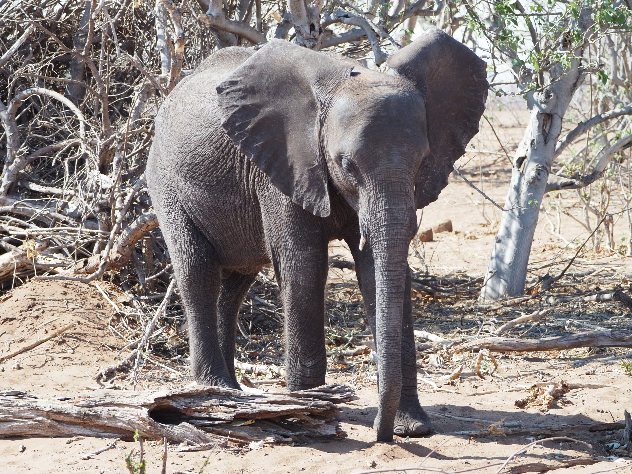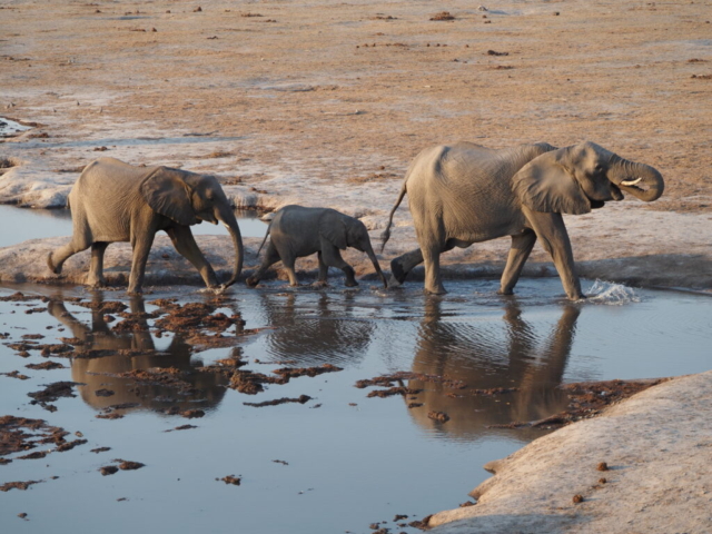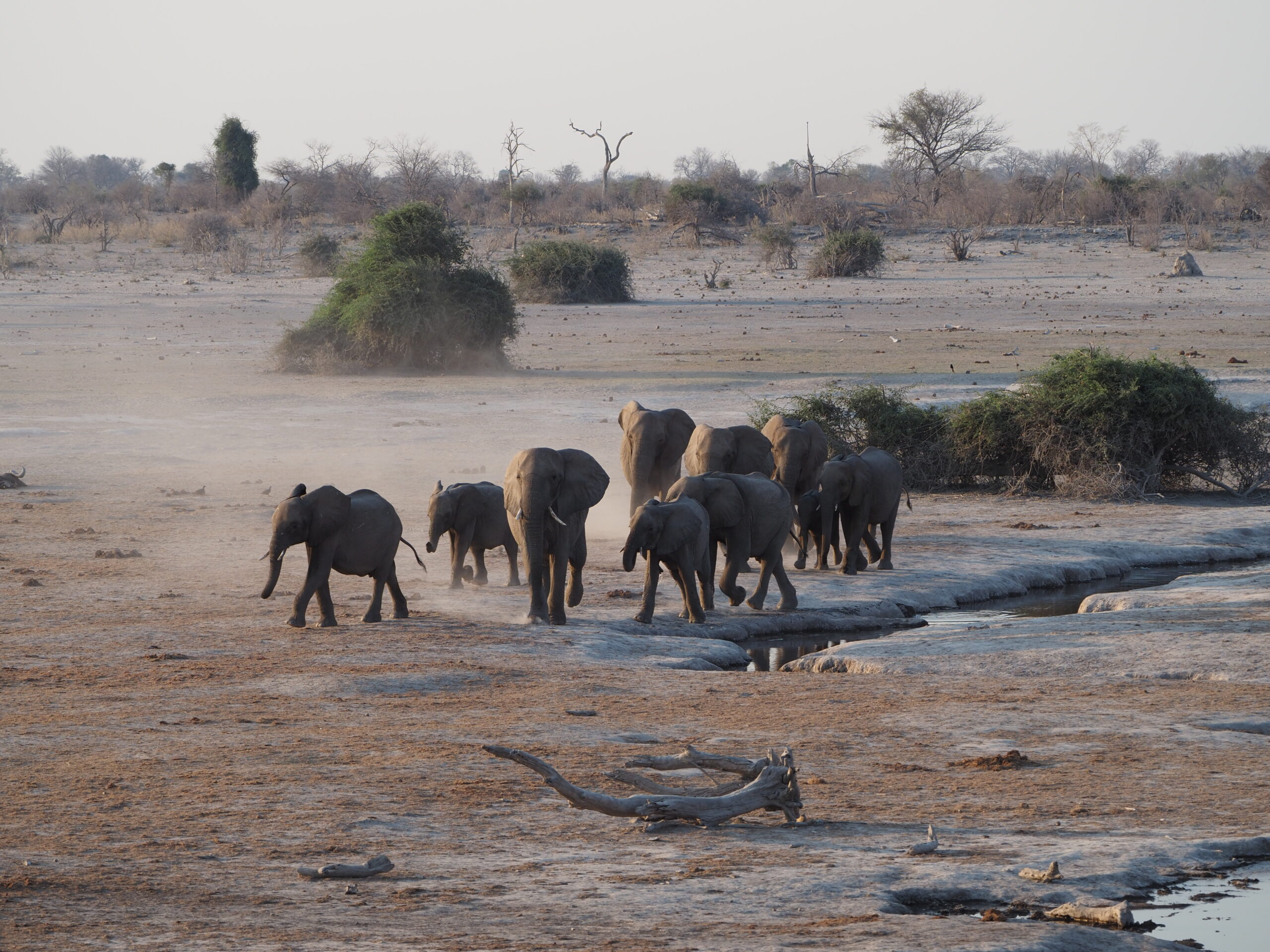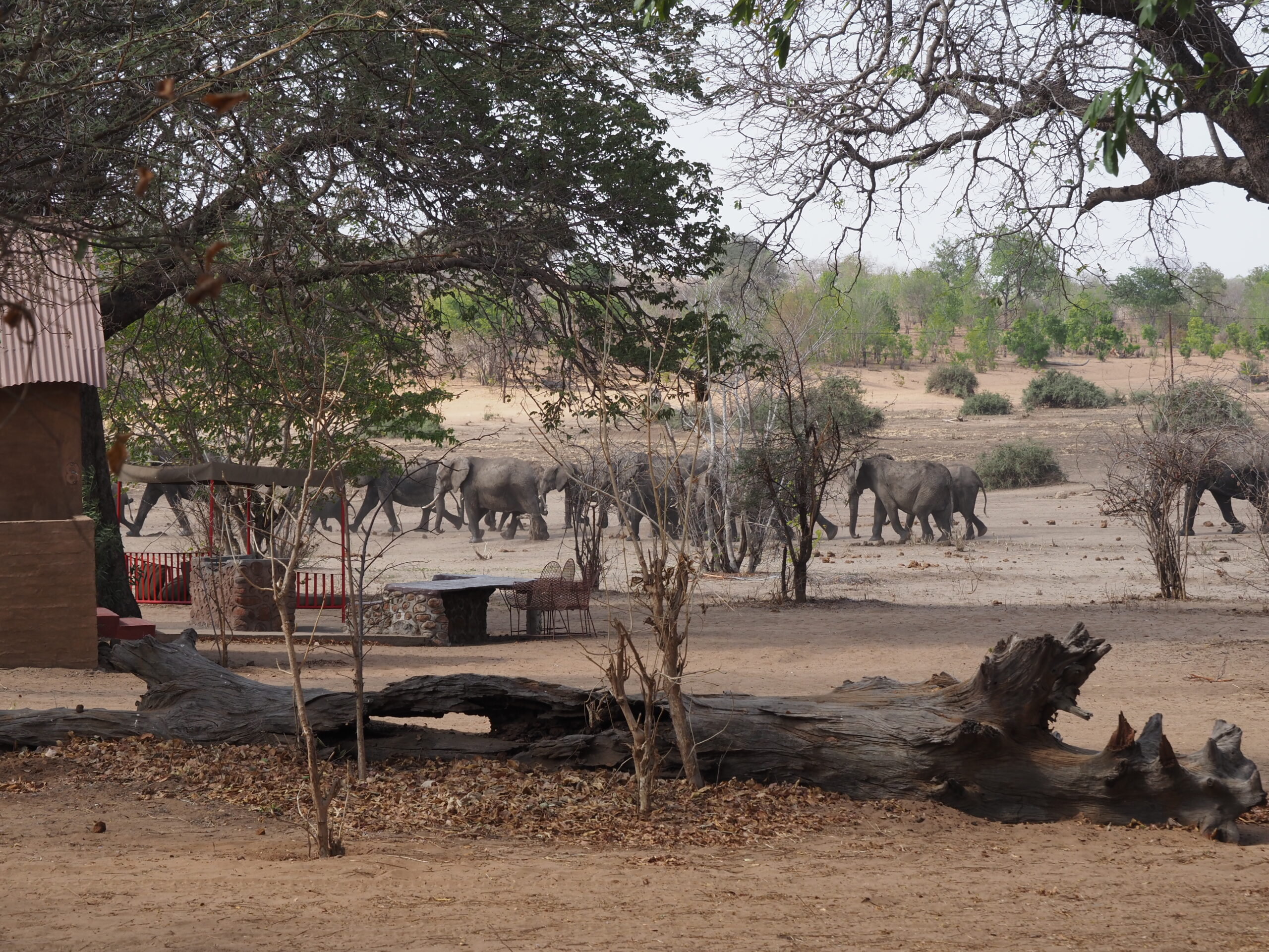 Nach unserer Sambia Reise freuen wir uns Botswana zu durchqueren. Allerdings ist die Hitze und die Dürre erdrückend. Das Elephant Sands ist ein Camp, das neben einem Wasserloch für Elefanten gebaut ist, und ein wahres Elefanten Erlebnis verspricht. Nur ist aktuell das Wasserloch so erbärmlich klein und die Zahl der Elefanten, die sich laben müssen so gross, dass einem die Tiere sehr leid tun und wir gar keine Fotos machen mögen. Es bleibt aber trotzdem ein eindrückliches und olfaktorisch prägendes Erlebnis, mit den grauen Riesen.