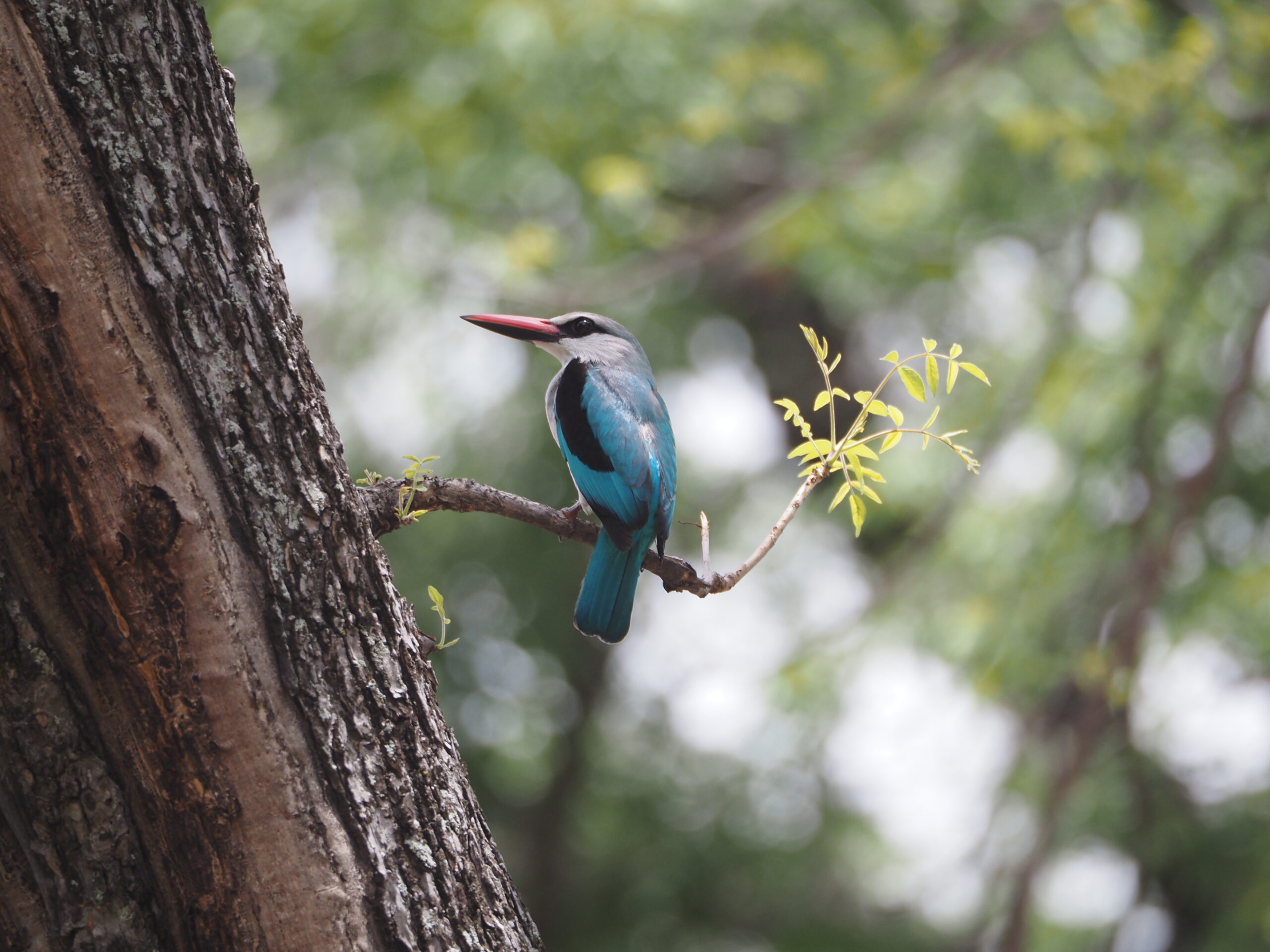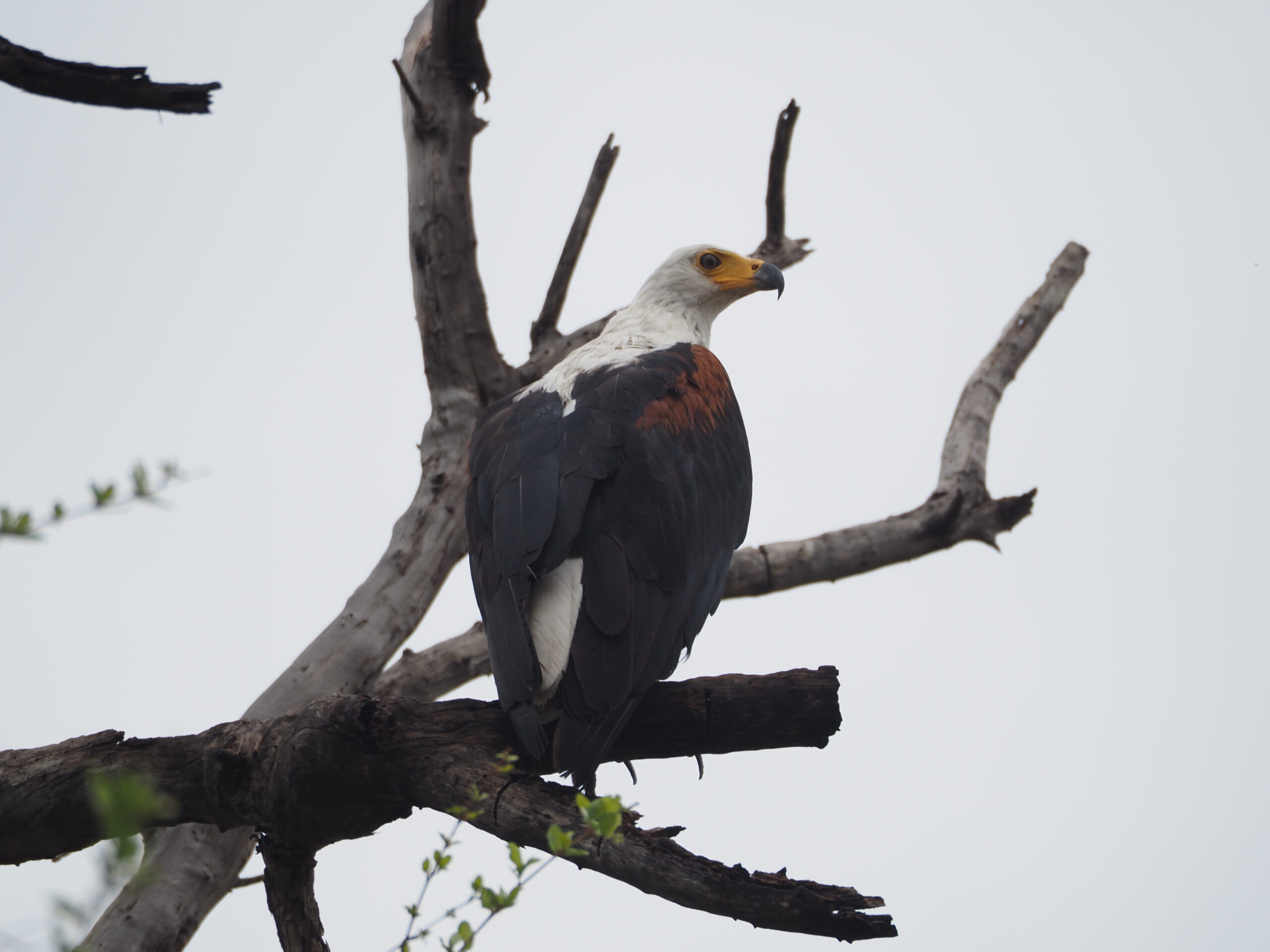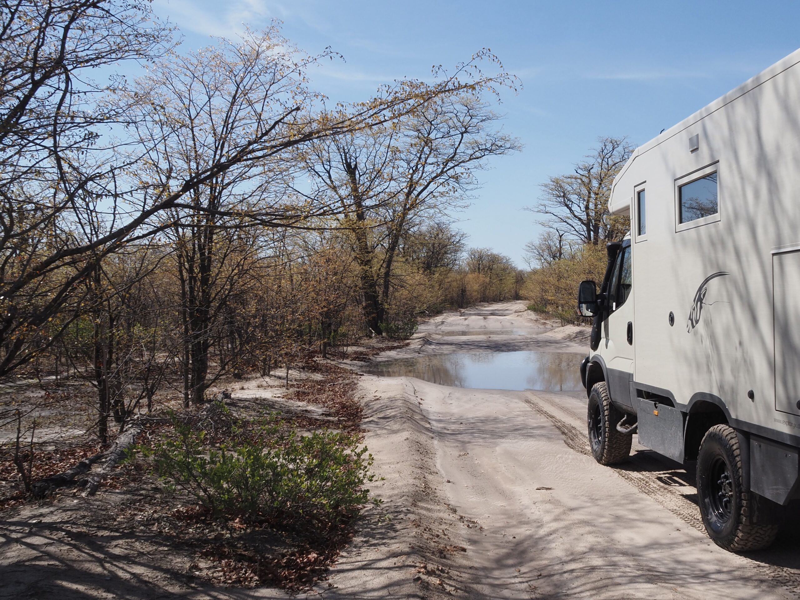 Der kürzliche Regen lässt die Blätter der Mopane Bäume spriessen, die kleinen Wege werden sumpfig, die Tiere unsichtbar und so beschliessen wir nach 2 Tagen den Moremi NP wieder zu verlassen. Zurück in Maun merken wir, dass die Klimaanlage in der Fahrerkabine nicht mehr funktioniert, wir finden ein Leck in der Kühlleitung. Für die Reparatur wollen wir nach Südafrika fahren und verlassen Botswana etwas früher als geplant.